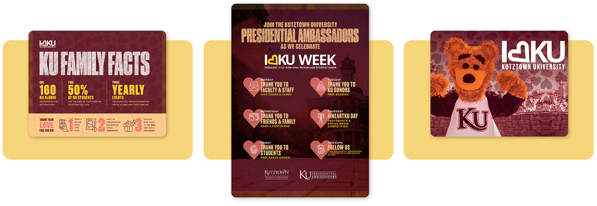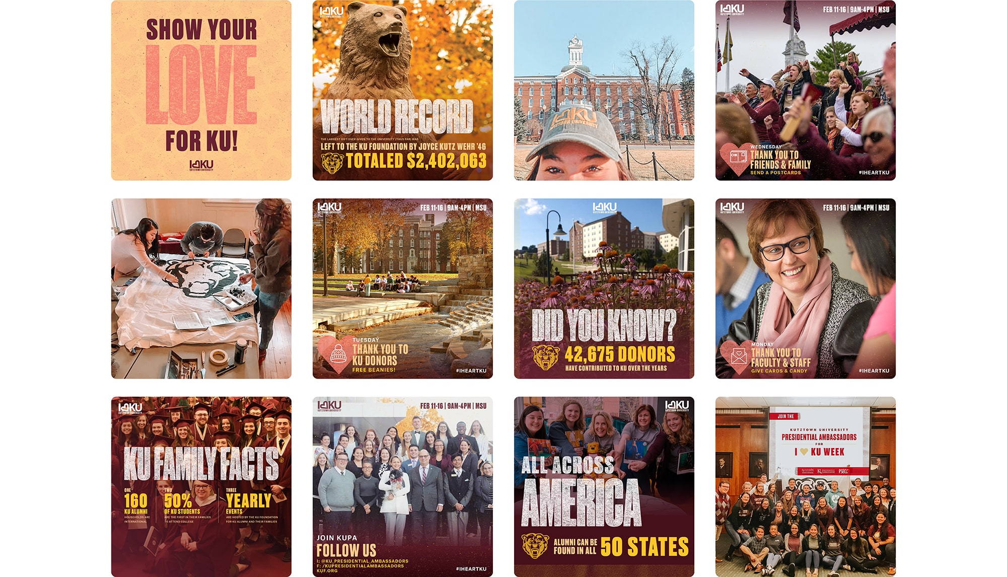 I Heart KU Week is a special week-long event aimed at expressing gratitude towards the donors and supporters who make it possible for students to attend Kutztown University. The week is also dedicated to promoting philanthropy and encouraging community engagement among students, faculty, and staff.